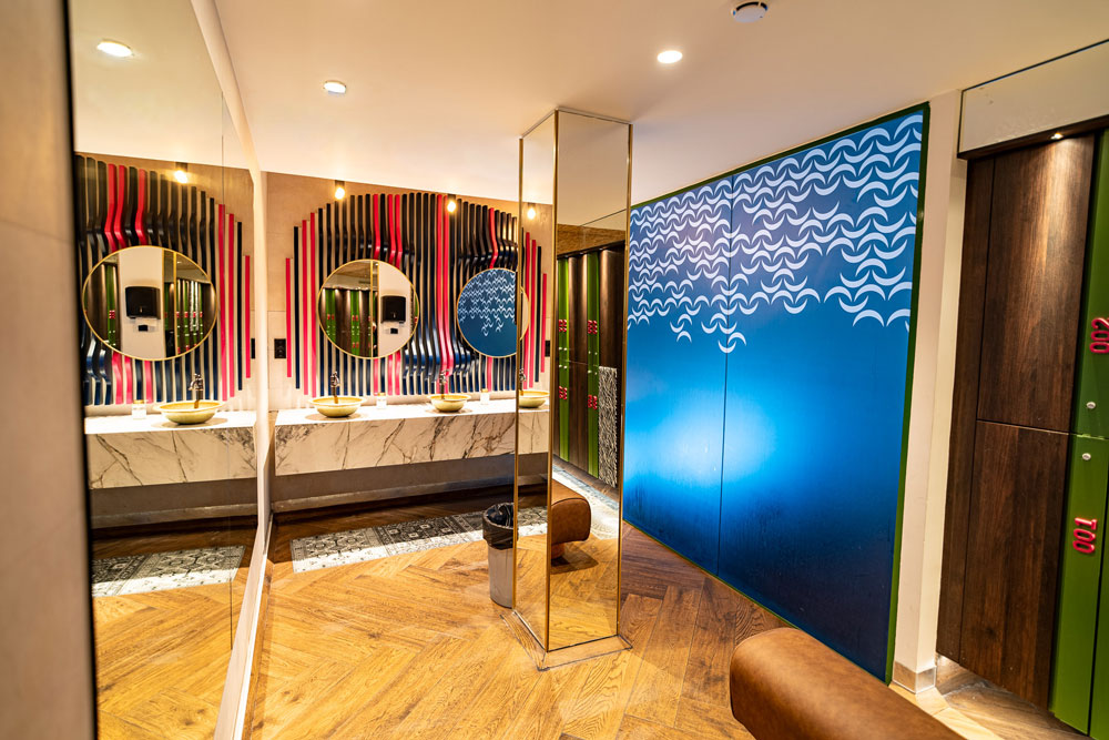 Vestuarios de lujo con acabados premium, duchas amplias y zona de cuidado personal.